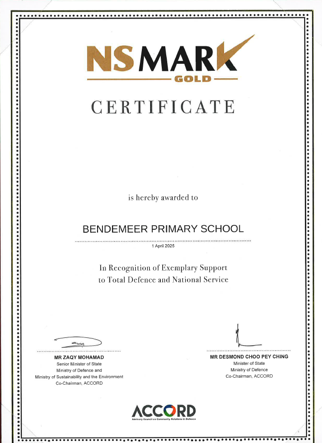 This achievement builds on our earlier recognition in 2022, when Bendemeer Primary received the National Service (NS) Advocate Award for Organisations and the NS Mark (Gold) under the TDA framework. As these honours are awarded on a three-year cycle, attaining them again in 2025 highlights our sustained efforts and consistent support for Total Defence and National Service.